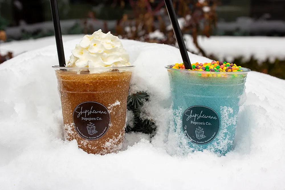 While you’re here, step inside, breathe in that warm, buttery goodness, and explore rows of gourmet popcorn that suit every palate. Take a look around and stay a while. We’ve got vintage candy and popcorn novelties, salt-water taffy, slushies, iced coffees, frappes, and more! We’re confident you’ll find something you love! Whether it’s in a single bag, a sampler box, or a giant tin, your favorite freshly popped Shipshewana popcorn is waiting.